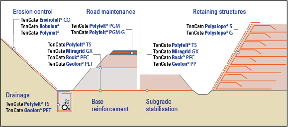 TenCate Geosynthetics deliver solutions that enhance the performance and design life of transportation engineering structures for paving. From our complete product line for Roadway and Railway Construction System Solutions, we offer materials that function for sealing, stress relief, adhesive bonding, and soil reinforcement. They offer robust mechanical properties coupled with high water flow capabilities that extend pavement life by retarding reflective cracking, waterproofing and reinforcing asphalt pavements.