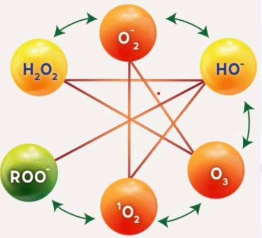 hydroxyl radical ions and is a very strong oxidant with a high concentration of oxidative energy; and it has a higher electronic footprint (Ev) vs a chemical