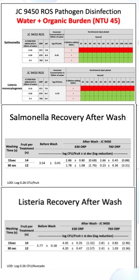 Independent studies at U.C. Davis Post-Harvest Department, confirms that JC-9465 effectively raises the ORP to +700 mV inactivating E.Coli, Salmonella, and Listeria in less than 10 seconds and improving shelf life up to 2X. JC-9465 was tested and evaluated by one of the leading and well-known plant pathologists in the US for safety in controlling pathogens such as E.Coli, Salmonella and Listeria, as well as its effectiveness in controlling biofilm, that many food researchers believe is the source of contamination and spoilage. The results are shown below :