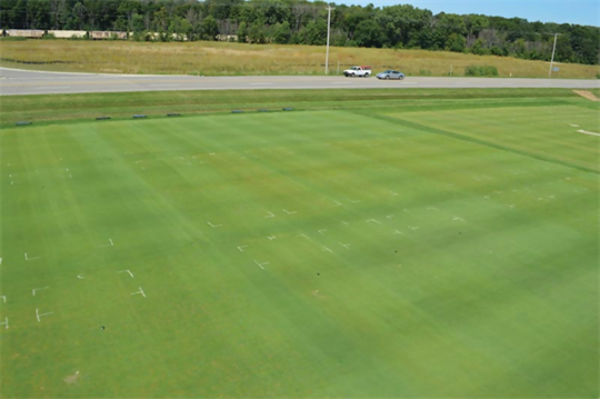 Irrigation was automatic and controlled by soil sensors that monitored the soil water content and temperatures. Standard fertilizer and pesticide protocols for maintaining golf turf grasses were applied to all plots. Some of the strip plots were subjected to traffic, ranging from none to moderate to heavy (See Figure 2). Irrigation was supplied during summer from June to September, to maintain the soil at eight, twelve, and sixteen percent volumetric water content (VWC).