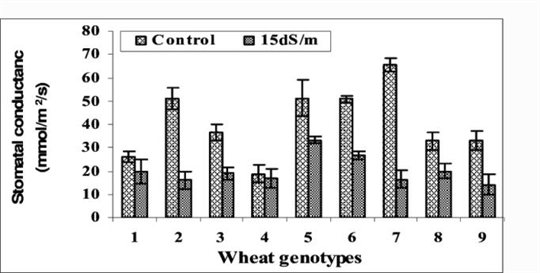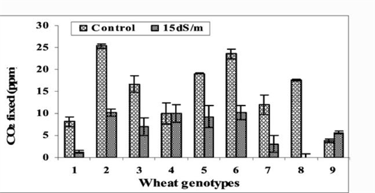 All the varieties performed better in non-saline conditions. There was less transpiration, stomatal conductance, and CO2 assimilation under saline conditions. This led to less green biomass accumulation and grain yield. There was a significant difference in how the eight varieties responded to salinity in all the parameters measured, as can be seen in the Figures 1-3.