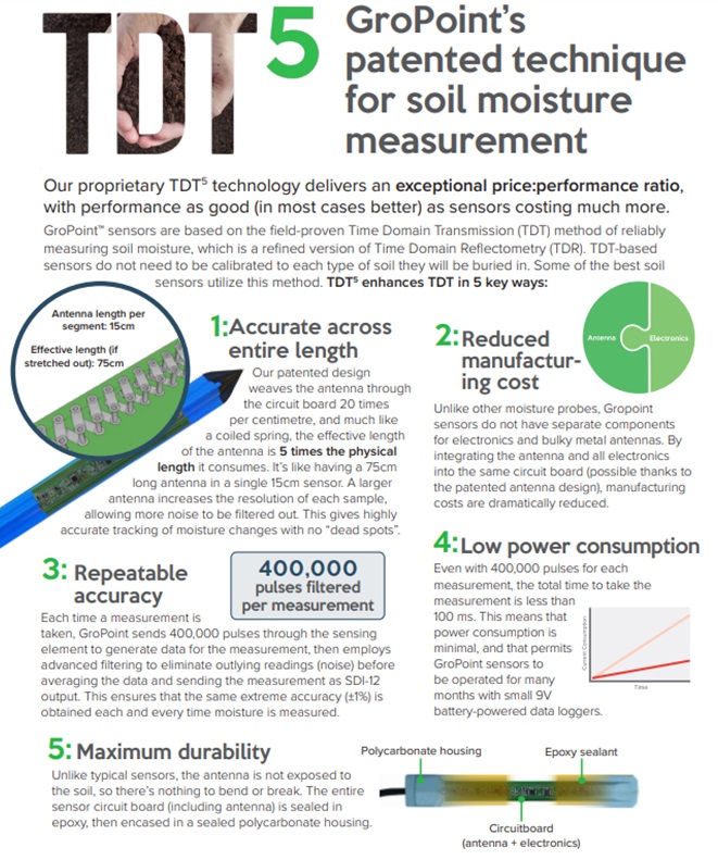 Our GroPoint Sensors utilize Time Domain Transmissometry or TDT technology to measure moisture content. Providing some background, TDT measures the time taken for an electromagnetic wave to propagate (travel) along a given length of a transmission line in the soil. The higher the moisture content surrounding the probe, the slower the signal travels. TDT sensors generally provide greater accuracy and lower power consumption than TDR sensors. The other advantage over the other methods comes down to the bandwidth of the measurement. TDT has a higher bandwidth than other methods like Frequency Domain Reflectance, making it less susceptible to the interference that affects capacitance.