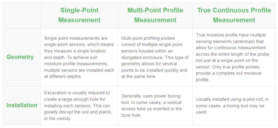 Another critical difference between soil moisture sensor types is the probe geometry and whether it measures a single point, multiple points, or continuously along the entire length of the probe. Point measurements are single-point soil moisture sensors, which means they measure a single location and depth.