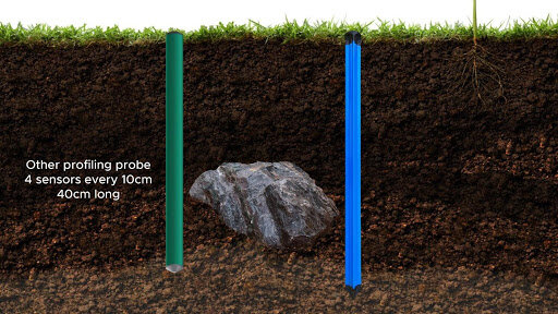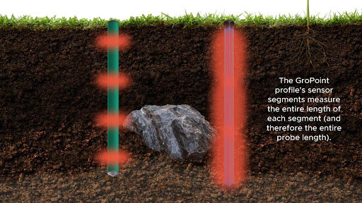 Depending on whether the soil moisture sensor you choose is a point measurement or a true profiling soil sensor like the GroPoint Profile, it is essential to know that the readings will be different when placed at the same depth and location. The Point Probe will give measurements at a specific depth, where the GroPoint Profile averages the moisture content over each segment of the probe, making it less susceptible to inconsistencies in the soil. Click through the below images for more information.