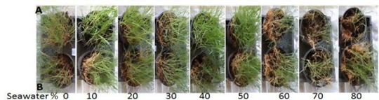 As Figure 2 shows, lower percentages of seawater were tolerated by the plants. At dilutions of ten to thirty percent of seawater, growth of leaves, shoots, roots, and levels of chlorophyll were all better than plants that were not irrigated. Turf succulence increased and helped the plants withstand salinity up to thirty percent seawater, but not any higher. At a higher percentage of salinity, the production of important enzymes in the plants was affected, which affected the productivity of the plants.
