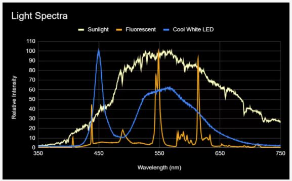 The spectrum of a light is how bright it is at different wavelengths. This can be closely related to colour; e.g., a red LED appears red because it emits light at 650 nm. However, differences in light spectra can also be hard to distinguish with the human eye. For example, in the figure below (Fig. 1), I’ve plotted three different “white” light sources: the sun, a fluorescent bulb, and a cool white LED. As you can see, they have pretty distinct spectral profiles.
