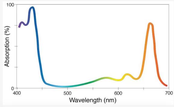 All algae use the pigment chlorophyll a to carry out photosynthesis. As you can see from the profile of chlorophyll a absorbance (Fig. 2), it is particularly good at absorbing light in the red and blue parts of the spectrum. This is why so many grow lights have lots of red and blue light (including the LED panels in our PBR).