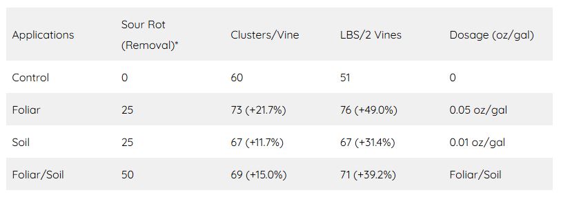 The results of the study demonstrated a 50% drop in sour rot compared to the control and 50% increase in crop yield using JC 9465 in a foliar application. Using the ROS, mineral oxychloride chemistry, JC 9465, we observed an increase in yield of harvestable clusters per vine (control-60 clusters per 2 vines vs JC 9465-73 clusters per 2 vines) for the foliar application.