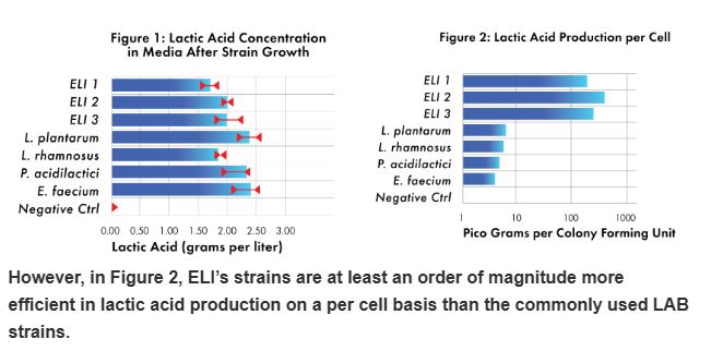Figure 1 & 2 (below) demonstrates the lactic acid concentration of a subset of ELI’S Bacillus strains compared to LAB strains commonly used in industry, such as Lactobacillus plantarum, Lactobacillus rhamnosus, Pediococcus acidilactici, and Enterococcus faecium. ELI microorganisms produce a comparable level of lactic acid under these oxygen-limited conditions.