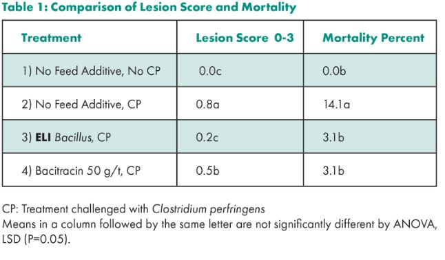 Southern Poultry Research performed a 28-day battery test with Cobb 500 chicks. The study included eight replicate cages for each treatment with eight chicks per cage, or 64 birds per treatment The probiotic treatments were added to the respective feed at a concentration of 2e6, or two million colony forming units (CFU) per gram of feed. The control treatments did not contain probiotic bacteria. The antibiotic Bacitracin was included in the test as the industry standard for comparison. On day 14 approximately 5,000 oocysts of Eimeria maxima were orally administered to treatments 2, 3 and 4. This was followed on day 19, 20 and 21 with the inoculation of the appropriate birds with Clostridium perfringens, the causative agent of necrotic enteritis, at a concentration of 1e8 (100 million) CFU per milliliter. On day 28, the study was completed with intestinal lesion severity and mortality recorded.