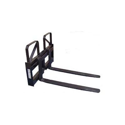 Frames are made of heavy wall high strength steel tubing. Side plates are made of thick steel. Pallet forks have a 3000lb. Capacity. Useable length of the forks is 48″. Forks slide and lock on 3″ increments. Includes a welded safety guard with anti-skid step plate in the middle on top of the implement. Weighs 404 #