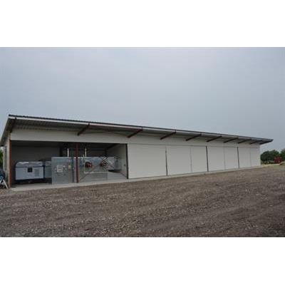 This Compact Hay Dryer with air recirculation dries 40 bales of forage and can accommodate both round and/or square bales. The plant in metallic construction is arranged in 4 rows and can be loaded and unloaded from both sides using a telescopic loader. This COMPACT Hay Dryer is equipped with an electrical motor which powers the fan. This COMPACT model uses thermal energy generated by a combustion engine. This COMPACT model has been prepared with a radiator in case the customer elects to install a BIOGAS plant in the future.