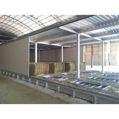 This COMPACT HAY DRYER with air recirculation dries 24 bales of forage and can accommodate both round and/or square bales. The plant in metallic construction is arranged in 4 rows and can be loaded and unloaded from both sides using a telescopic loader. This COMPACT Hay Dryer is equipped with an electrical motor which powers the fan. This COMPACT model uses thermal energy generated by a combustion engine.
