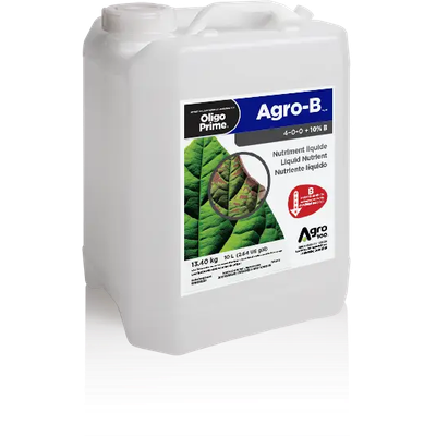 Agro-B mobility OPis an agro-liquid concentrated in boron designed to prevent and rectify deficiencies. A good nutrition in boron encourages plant growth, pollination, fructification and assimilation of other nutrients.Agro-B mobility OPcontains sorbitol, an osmoregulator directly metabolizable and native to the plant, that forms stable and soluble boron complexes to ensure optimal absorption by the leaves, fast translocation facilitating boron mobility and availability to all parts of the plant.
