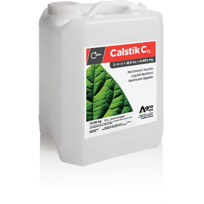 Calstik C12 C-plex is an agro-liquid with 12% calcium designed to prevent calcium deficiencies and supplement the soil’s fertility level. Calstik C12 C-plex is chelated with the innovative C-plex chelating agent, a small carbon-based molecule that improves absorption and promotes transport of nutritional elements in plants. This natural product does not burn leaf tissues. Its higher calcium concentration makes it an economical source. It can be used on every crop based on soil or tissue analyses or as soon as deficiency symptoms appear. For more information on Calstik C12 C-plex , consult your agronomic adviser.