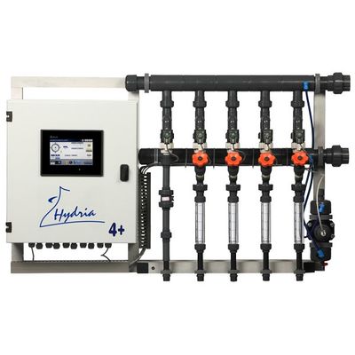 Hydria 4+ Touch is a revolutionary fertigation system for greenhouses that require up to four nutrient plus one acid stock solutions. Hydria 4+ Touch carries all the basic features of the higher Hydria Series (i.e. Hydria 5+ Touch and Hydria 8++ Touch) and the same user-friendly menu in English, accessible through a 4.7-inch (or 7-inch upon request) colour touchscreen. A fertiliser mixing tank can also be incorporated upon request. Just like all our products, Hydria 4+ Touch is a fertigation system constructed using materials of excellent quality. The various features that it bears and its affordable price make Hydria 4+ Touch the best choice for medium-sized hydroponic or conventional greenhouses.