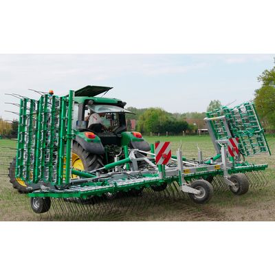 The Agronomic Tine Harrow is designed for effective hoeing and mechanical weed control across various crop types, including cereals, corn, beets, rapeseed, potatoes, and vegetables. This machine features a unique foldable welded frame and a distinct design where each 7 or 8 mm tine is equipped with an independent spring, enhancing uniformity in soil work and reducing the 'rake' effect common in traditional harrows. Notably, the harrow includes a 470 mm tine suspended above a panel with the highest clearance in the market, enabling passage through tall crops. Adjustable tine pressure can be configured mechanically or hydraulically, allowing for instantaneous adaptation to differing terrain types. Enhanced controls such as the manual aggressiveness adjustment and hydraulic settings permit fine-tuned management directly from the tractor cab. The machine's robust frame supports optimal pressure distribution, backed by Kevlar-reinforced wheels to resist punctures, ensuring reliability and durability.