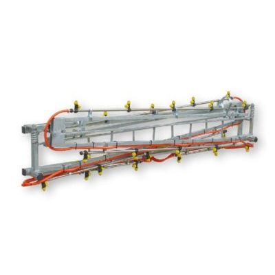 Mechanical spraying boom 4,5m - 06m - 08m - 10m - 12m (folding clusure). Galvanized tubular steel structure. Antishock rotation with adjustable power. Threaded stainless steel liquid-carrying pipe. Holes Ø 7 mm, distance 500 mm. Metal hose clips. Without nozzles, spray tips and connection piping.