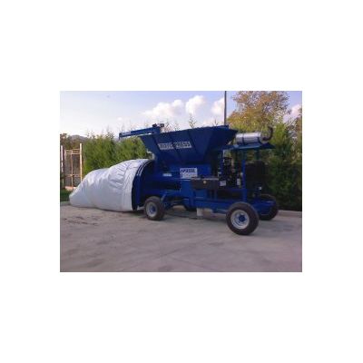 RotoDis is a compact self powered bagging machine, suitable to bags many type of products. Mainly this machine has been designed for distilleries to bag grapes waste, but is also ideal to bag any type of cereal. RotoDis is a 4 wheel base machine with an engine in the central part, and a hopper conveyor in the front top part. A system of transfer augers moves the material from the conveyor to the compression tunnel.