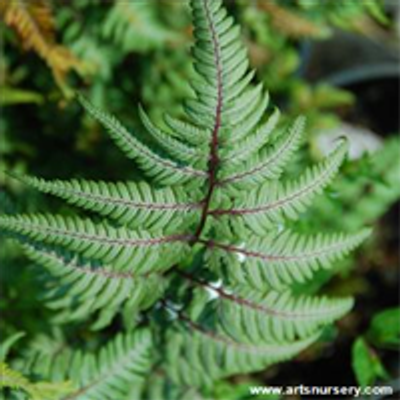 A haunting new hybrid is surprisingly elegant with its rigidly upright gray-green foliage. Neat, formal fronds reflect an almost fluffy look as light plays off the metallic sheen. A natural for the woodland garden with upscale attributes. Deserves a place front and center.