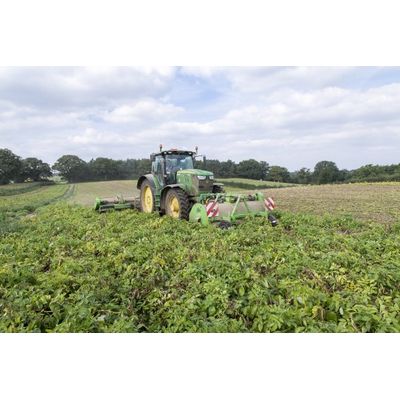 With an AVR haulm topper, you can be assured of efficient haulm removal! The most important goal when it comes to topping haulm is the destruction of the haulm by shredding it and subsequently disposing of it. The AVR Rafale has been developed to achieve this goal with the utmost precision, while simultaneously limiting fuel consumption. The improved design of the topper has increased its suction power which, in turn, improves the machine’s topping capacity significantly. The Rafale haulm topper is available as a 2-row up to 8-row version. 2- and 3-row machine with lateral discharge available.