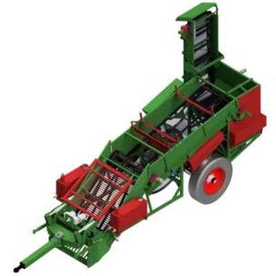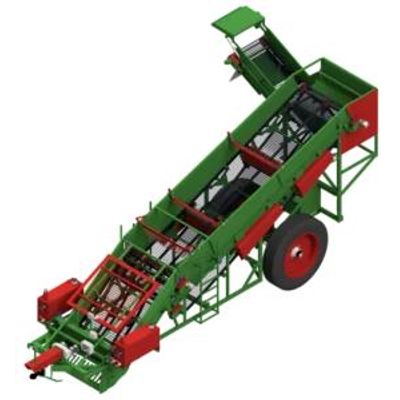 This bed harvester is suitable for harvesting seedlings. The tractor`s lifting device is used to set the height. The soil and plants enter the screening belt via the movable blade. This sieving belt rotates upwards at the same speed as the driving speed to hold the bed together. Vibrators under the sieving belt loosen the bed. At the rear of the harvester, the plants are picked up manually and put into boxes. At the top is a box platform for the empty boxes. The planter includes a steerable wheel axle for sharp headland manoeuvring. The whole unit is controlled via a push-button box in the tractor.