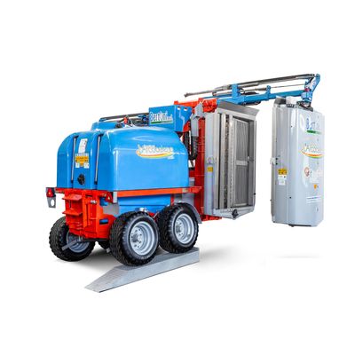 Ideal for working in rows 2.00 to 3.80 metres apart. Full drain fibreglass tank with internal isophthalic treatment. Built-in circuit washing tank. Independent hand-washing tank. Ø400 H333 mm stainless steel basket for filtering water input into tank. Dispensing and mixing pump + retrieval pump made of brass with Viton membranes. Product mixing in ENAMA-certified tank with “Venturi” system. Chemical suction unit with hydro-venturi system for inserting products into tank.