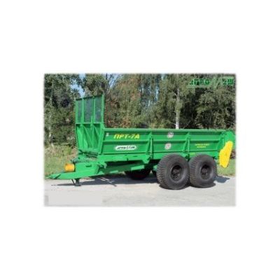 The manure spreader PRT-7A is designed for transportation and overall surface application of solid organic fertilizers as well as for transportation different agricultural loads with rear conveyor discharge. The manure spreader PRT-7A has a number of evident advantages in comparison with the previous versions: it grids better applied fertilizers thanks to modifications in the spreading device; use of hydraulic reversible drive in the working transporter provides smooth stepless regulation of its speed and application rate correspondingly; reversible transporter hydraulic drive allows to switch on reverse motion with one move of the tractor hydraulic distributor lever in case if any foreign object locks the spreading drums; spring-loaded tension sprockets applied in the design increase the reliability of the drive and provide automatic tension of the spreading drum chains and general improvement of the operator labour; transversal stability has been increased.