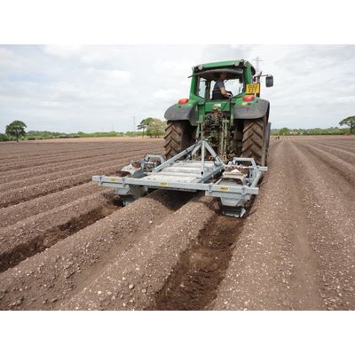 The Briggs Tied Ridger has been developed to prevent rain and irrigation water run off from crops grown on sloping land, thus giving a dramatic reduction in surface erosion, fewer green potatoes, reduced fertiliser loss and a reduction in water requirement. The machine incorporates specifically designed paddle wheels to form and press consistently sized and spaced dams, that will be effective even on light land. It is heavily ballasted and runs on a depth wheel in each row. In order to avoid damming tramlined rows, a hydraulically operated freewheel is fitted to both rows; this overrides the trip mechanism and allows the paddle wheel to rotate freely whilst the tramliner is operated.