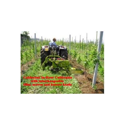 This is one of several machines dedicated to working the soil between trees and vines. By varying the attachments, you can till, disk or mound the soil around a plant. The hydraulic sensor to dodge around plants is standard on all models. As shown below, these machines have working widths ranging from 50 to 116 cm (or 20 to 45 in), and can work in rows from 98 to 129 inches wide.