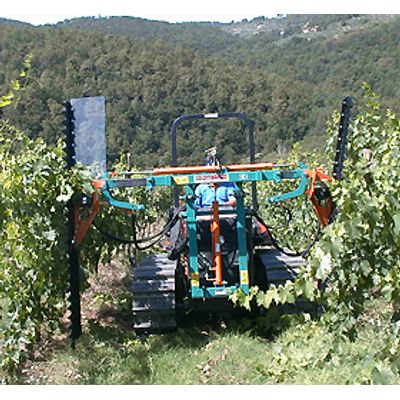 - Double Wire Lifter for the trellising of the summer vegetation of the vineyards with espalier training (Guyot – low spurred cordon). On this model the lengths of the shoot conveying belt can be varied and fitted to the optimal period of intervention. The special shoot collecting belts convey the shoots upwards without damaging them; the speed of the belts can be regulated according to the advancement speed rate.