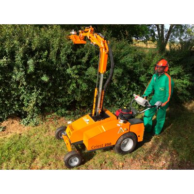 Self-propelled circular saw tree cutter, especially narrow-width for trimming horizontally or vertically flat in urban areas. Offset cylinders and automated levelling systems for perfect and precise pruning.
