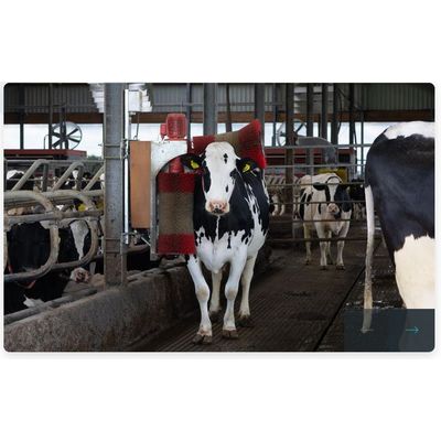 The cow brush is waterproof and is being cooled from the inside, so that it can also be mounted outside. The bearings and transmission are of heavy quality material, so that the cow brush is even be being used in bull barns. The cow brush moves vertically due to 25 cm spirals and a bit horizontally due to rubber spirals. In this way it adjusts itself to every kind of cow or bull.