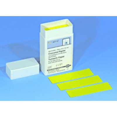 Turmeric paper is a filter paper impregnated with curcumin, the yellow dye extracted from the roots of Curcuma tinctoria (yellow ginger). It is used to detect boric acid and borates.Color reaction: yellow « red; oxidizing agents and iodide interfereApplication: The solution to be tested is acidified with dilute hydrochloric acid (pH 1 û 2); the turmeric paper is dipped into this solution and allowed to dry. Depending on the borate concentration the yellow paper turns orange to red. When the dried reaction zone is dipped into concentrated sodium hydroxide solution (NaOH), it turns greenish-black in the presence of boron compounds. û The yellow turmeric paper will change color from yellow to brown-red with bases. Limit of sensitivity: 20 mg/l boron.