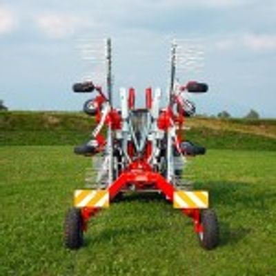 Rotary swather rakes have been built for large spaces and, thanks to the tow-bar, can be easily hooked up to the tractor and follow the trailer. The large tandem axle offers stability and the swather rake can be easily moved thanks to the height adjustment with hydraulic piston.