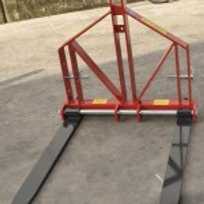This forklift attaches to the three points of a tractor for small agricultural farm transport. It is supplied with adjustable brackets with adjustable width and with capacity 700 kg. If desired, can be equipped with tips for transporting bales of forage.