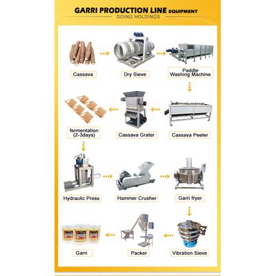 Garri processing machine is mainly used to process cassava into garri, which mainly includes dry sieve, paddle washer, cassava peeler, cassava grater, hydraulic pressure, garri fryer and garri sieving machine. Garri processing machine manufactured by Doing Company can ensure the produced garri products superior in quality and high in yield. And we can design and customize garri processing machines in different configuration based on your situation and requests.