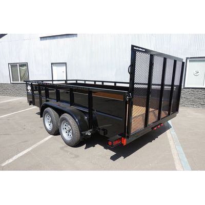 Single 3500 pound Dexter cambered axle, 15 inch tires (205/75D15) on 5on5 rims, 3 inch channel tongue, 2 inch coupler, 2000 pound tongue jack, 3x2 angle mainframe, 3x2 angle crossmembers, 24 inch tall sides, 4’ expanded metal rampgate, automotive grade enamel paint and primer, LED lights, NATM certified, 2 year warranty.