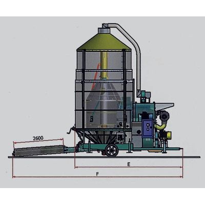 Capacity m3 20.5. Capacity t 15. Height during transport m 449. Height of cylinder A m 4.49. Operating height B m 5.15. Operating height with dust aspirator C m 6.06. Height of outlet chute D m 2.80. WIDTH m 3,00. Length E m 5.62. Length with 2.60m. Loading hopper F m 8.78. Lenght with Loading auger G m 757. Fan m3/h. 45000. Burner Kcal/h 900.000. Output t/24h. 75. PTO input hp 65.