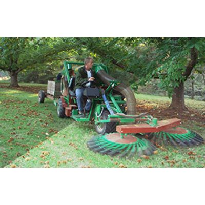 The new mechanical mounted harvester MEK 1800 permits the shell fruit harvest thanks to the principle of mechanical gathering from the ground. The machine is attachable to tractors with three point linkage both anterior and posterior, power take off of 540 r.p.m. The harvest is carried on by horizontal brushes which displace the product towards a series of augers and screens (replaceable in base of the calibre of the fruit to harvest) which make a first cleaning. In the end the product is pushed by a fan placed at the machine’s side in bags or in a trailer. On demand it is possible to install a lateral brush to harvest in the inter-row. For maximum harvesting performance, it is suggested to prepare the ground, working it different times by mulcher (grass cutting) during the previous year and before the produce falls to the ground