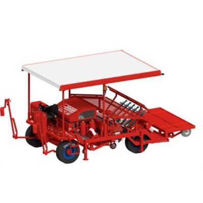 The FERRARI FPC transplanting machine was developed to accomplish simultaneous operations in one pass. This transplanter can lay either polyethylene or biodegradable film to the ground, make holes through the mulch and transplant square block pots. The output is on average 5,000 plants per hour on every row. FPC can be either tractor pulled or self-propelled. Different frames are available according to the size of the film roll and the number of rows installed on the machine. Every row is equipped with a plastic belt which is leading the plants to a synchronized system of fingers that are separating the square blocks and are placing them into the holes. The holes are made by a perforator equipped with needles.