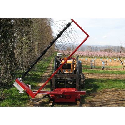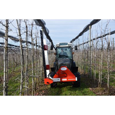 The DarwinPT was designed to work mainly in V-systems as we often find in peaches, plums and apricots. It is attached to a front loader directly or by forks. The spindle has a tilt angle of 180 °. This allows the DarwinPT to be lifted to the height of the tree tops and work horizontally over the trees. Should the open vase trees be very wide, there is also the possibility of tilting the spindle into the tree interior and thin there. The high tilt angle ensures that the sides as well as the crowns of the tree can be thinned.
