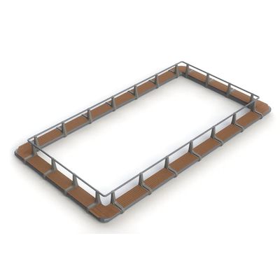 We manufacture square metal cages from 5x5 up to 15x15 perimeter and orthogonal metal cages, 6x12 and 7x15 perimeter. We use hot dip galvanized steel for the main structure and walkways while the buoyance is given by HDPE floats, which we produce ourselves, filled with expanded polystyrene of 20kg/m³. Joints are made by stainless steel bolts and we use elastomeric seals for greater durability.