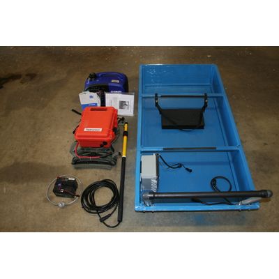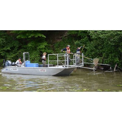 This kit can be purchased with or without the barge. It allows the use of the popular HT2000 Backpack Electrofisher in deeper but still wadable streams. A metal plate is mounted on the bottom of the barge and up to 3 anode poles can be attached to the junction box. All poles have operators switches as well as the navigator of the barge. The small generator is used to keep our Lithium-Ion batteries at full charge for optimum effectiveness.