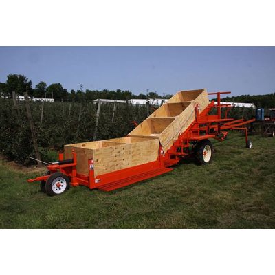 The Bin Trailer provides the capability to move multiple boxes both in and out of the rows. The clamp style trailer straddles the boxes and retractable forks slide under the box allowing vertical lifting. The Bin Trailer can easily be used in conjunction with the Harvest Platform. By using the Bin Trailer, empty boxes can be brought to the rear storage trailer of the Harvest Platform and full boxes can be retrieved from rows. The air suspension in the Bin Trailer, allows for smooth transportation of the fruit in any orchard.