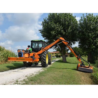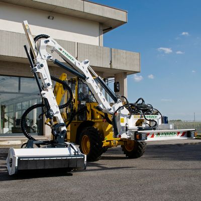 Brushcutter VeryVis by Hymach is a green maintenance machine, with a hydraulic arm and rotor cutting head, ideal for work on motorway and roadside verges, slopes, steep embankments, riverbanks and rural areas. It can be equipped with a patented system of auto-alignment of the head, which allows it to automatically regulate itself, so that it is always in a perpendicular line with the tractor, whilst the arm can be rotated as the operator wants.