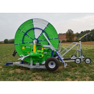 Hydraulic lifting device of trolley. Hydraulic rotation of turntable. Hydraulic lifting of drawbar. Telescopic hydraulic feet. 4 Speed gearbox. Power take off. Turbine flanged on the gearbox with built-in by-pass. Flexible connection pipe. Galvanized raingun trolley mounted on variable track wheels. Raingun. Set of nozzles REFLEX raingun from Ø 24 to Ø 32. Set of nozzles EXPLORER raingun from Ø 28 to Ø 40. Pressure gauge (glycerine bath). Winding handle. Speed equalizer. Tachometer. Hydraulic system by rapid couplings to tractor. Safety guards. 2 wheels 10.0/75-15.3 10PR 6F. Hot galvanized chassis and reel coated by epoxy resin and painted with polyurethane paints. Safety guards made of steel, swaged galvanized and painted. Galvanized double water inlet. Polyethylene hose made by unadulterated raw material.