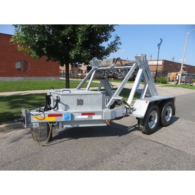 Self-Loading Reel-Lifting Functionality. Dual Hydraulic lifting cylinders, operated by a remote-controlled battery and pump system. Spring-Loaded Safety Locking Features. Enclosed Toolbox for pump and battery protection. 8K Stub Axle, with Dexter 12" x 2" Electric Brakes. 5500 LBS Reel Weight Capacity. Max. Reel Dimensions: 60" Wide x 98" DIA. 2.5" Solid Reel Bar with Milled Clamping Surfaces. Heavy Duty Fenders. Reel Locking Collars. Grote Lighting System & Wiring Harness. Sandblasted Frame, Epoxy-primed and Polyurethane Gloss Black Topcoat.