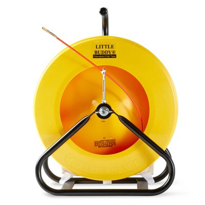 Jameson Little Buddy fiberglass fish tape is a lightweight and portable unit that is ideal for running inside and outside conduit drops. The non-conductive wire puller features a round rod that slides easily over existing wires through multiple bends. Operates vertically or horizontally with a drag brake and safety feed eye to control payout. The included accessory kit stores in a canvas pouch for convenient access.