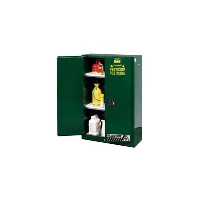Sure-Grip EX Pesticides Safety Cabinet, Dims. 44"H, Cap. 30 Gal., 1 Shelf, 2 M/C Doors. Pesticides present a substantial danger to people and the environment when improperly stored. Pesticide safety cabinets allow segregation of liquids stored at the worksite, eliminating the potential for drips and spills during the transfer of pesticides. Dissimilar pesticides stored separately prevent one from contaminating another or the accidental use of the wrong chemical. Safety cabinets that are specifically designed to house these types of chemicals offer features including sturdy double-wall, 18-gauge steel construction with 1½" of air space and dual flame-arresting vents.